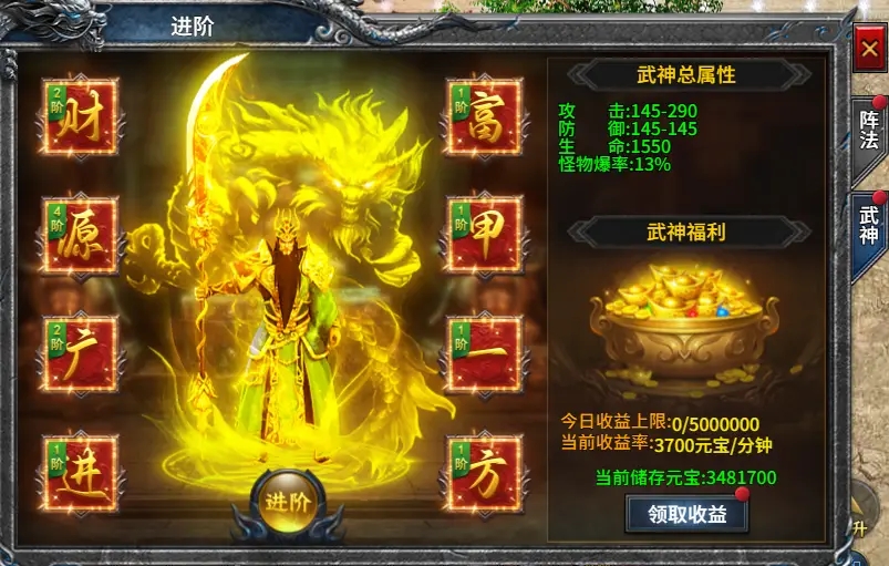 使用武圣精华可进阶武神装备等阶越高元宝收益越高