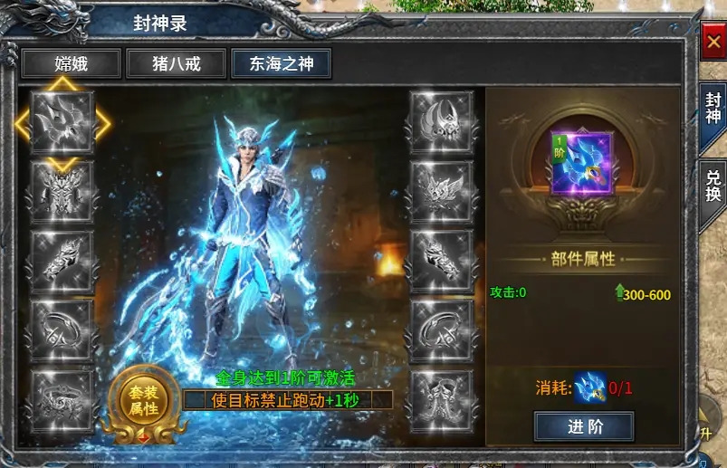 使用封神印记可兑换封神装备,当某一套装全身达到20阶 即可激活时装。